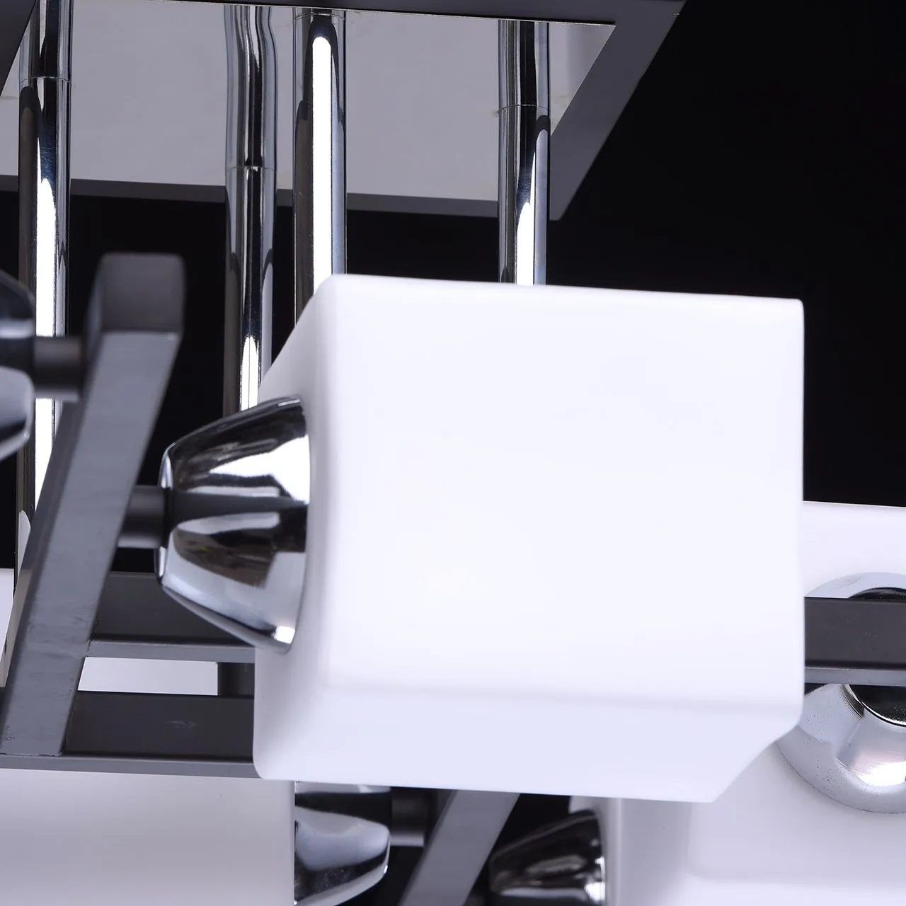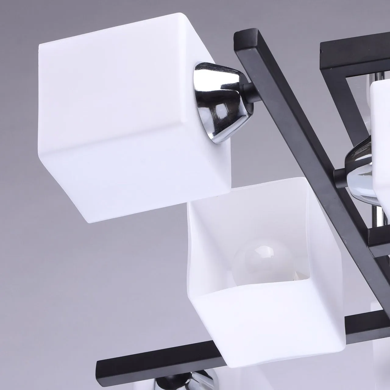 Металлическое основание цвета темного кофе, декоративные вставки из металла цвета хрома, плафоны из