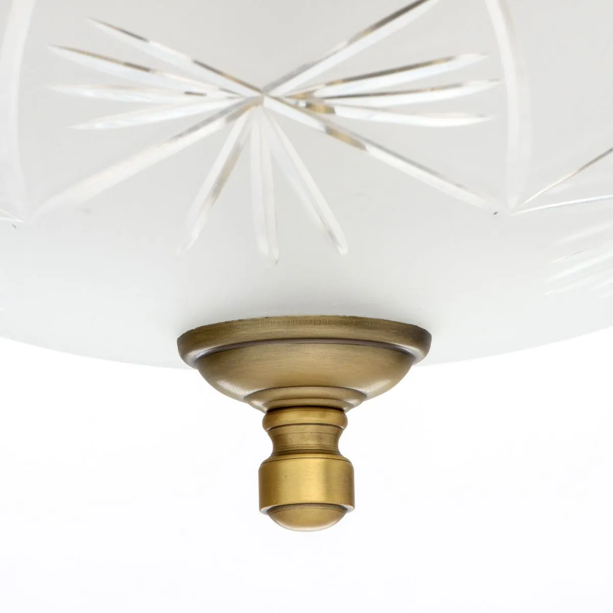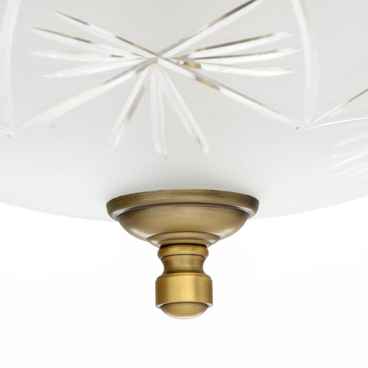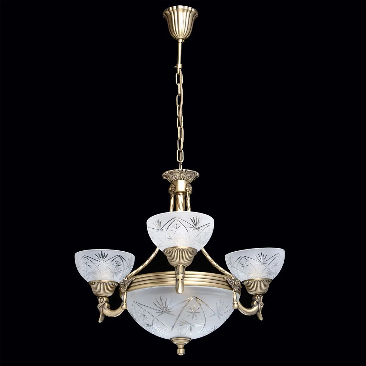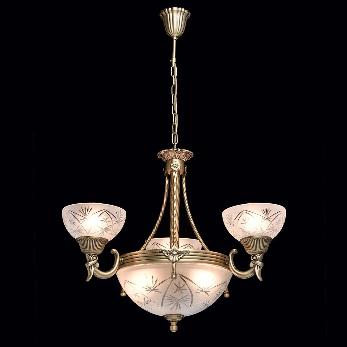 Алюминиевое основание цвета античной бронзы, плафоны из матового стекла с резным узором.