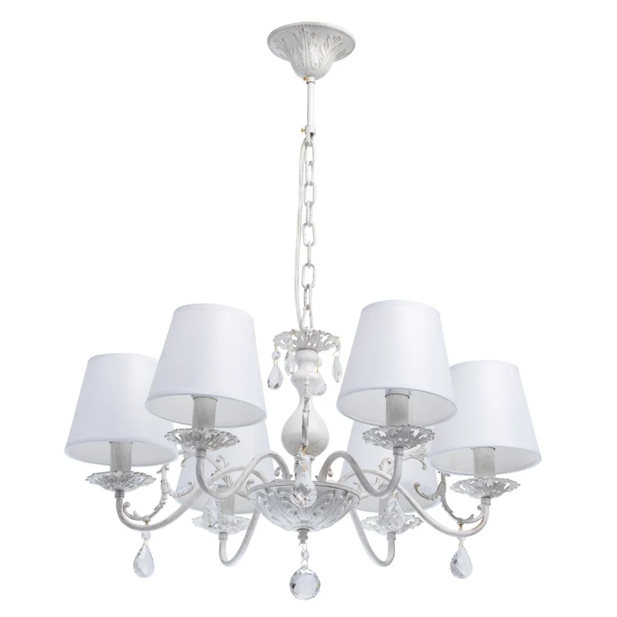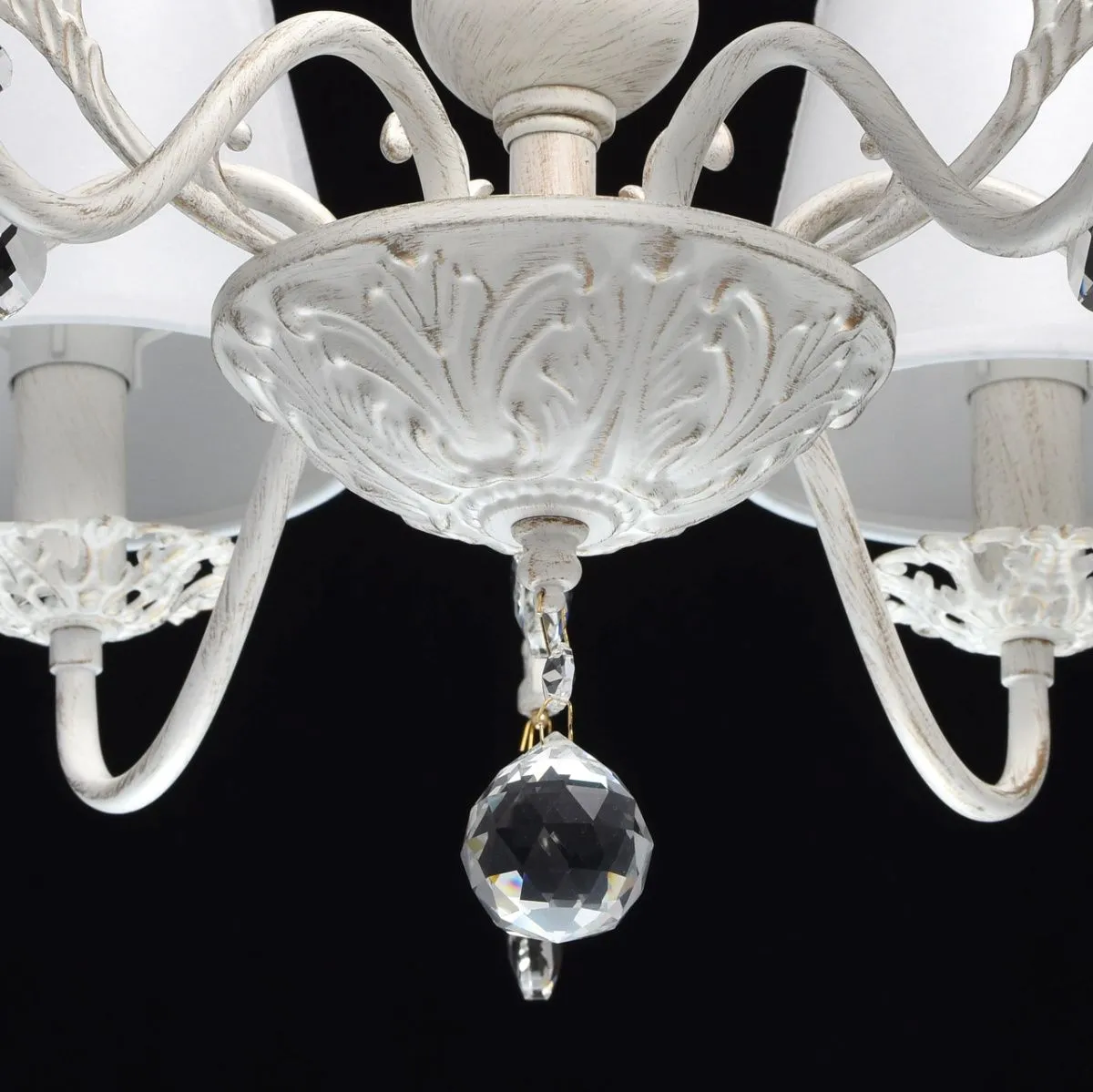 Металлическое основание окрашено в белый цвет с золотистой патиной. Абажуры - текстиль белого цвета.