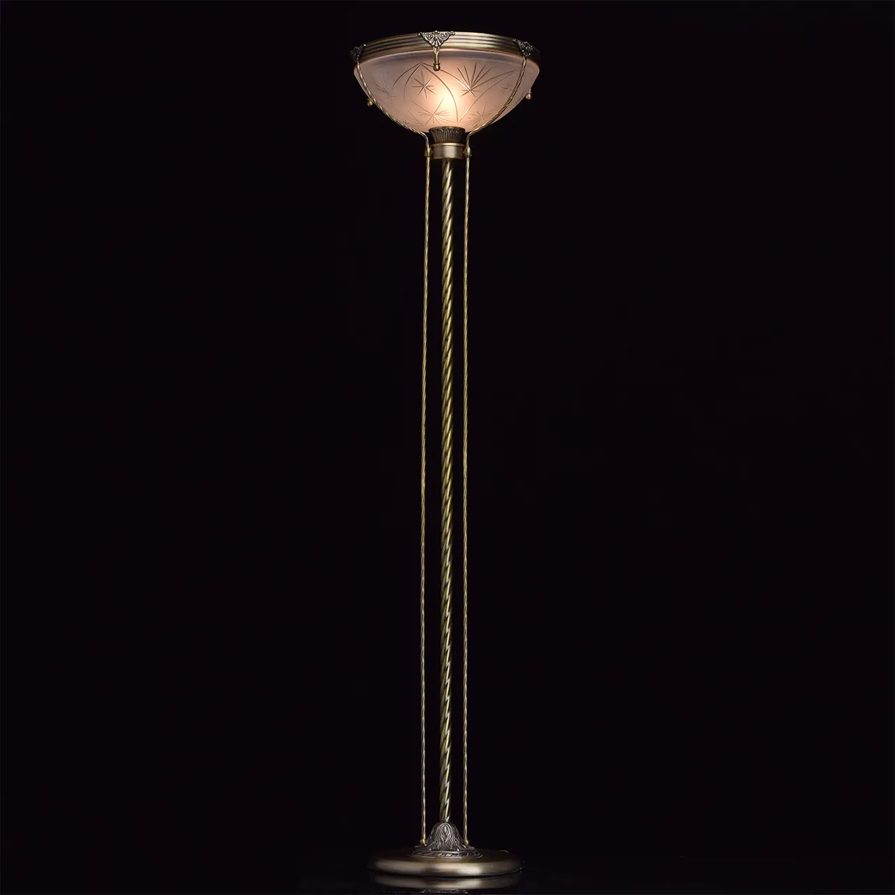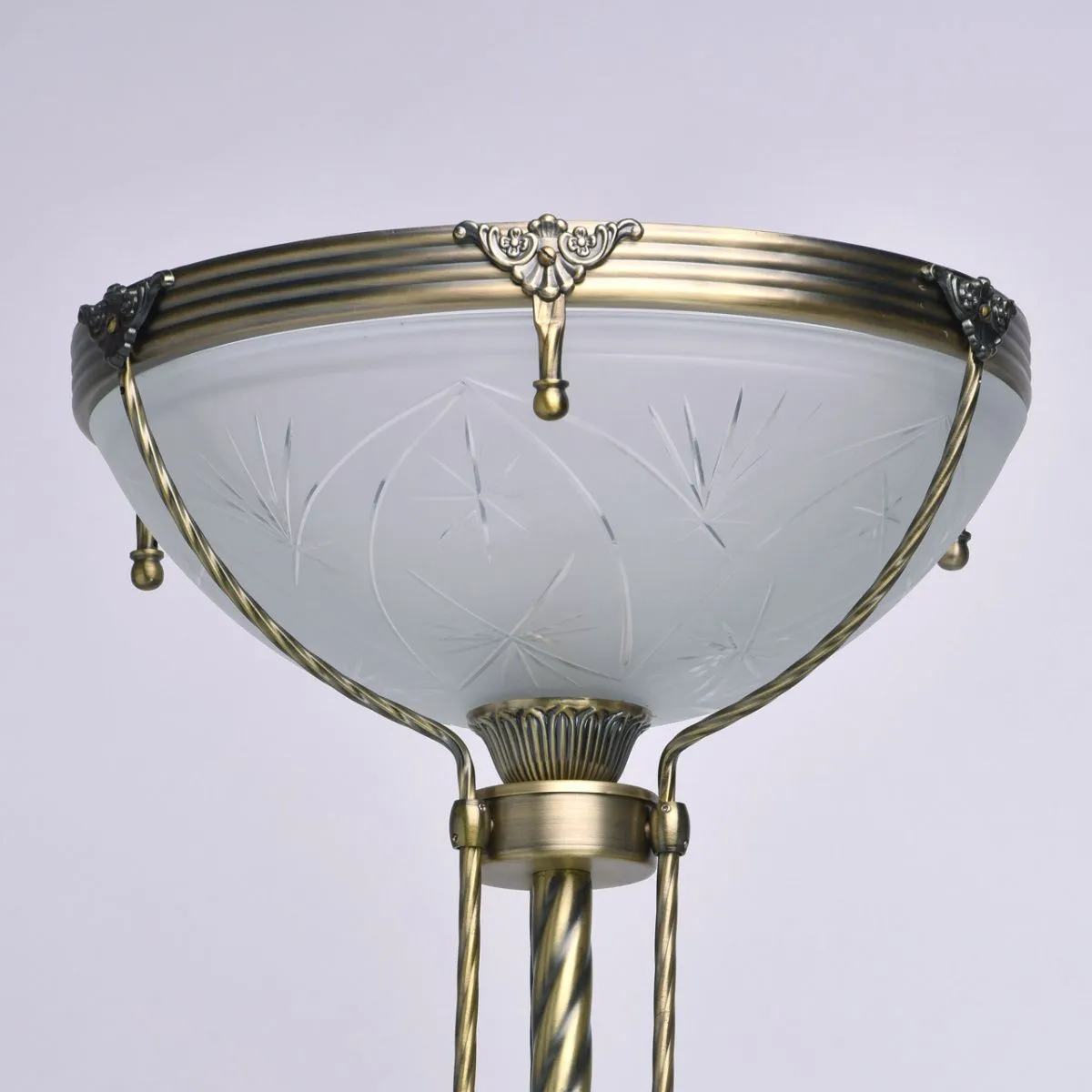 Алюминиевое основание цвета античной бронзы, плафон из матового стекла с резным узором.